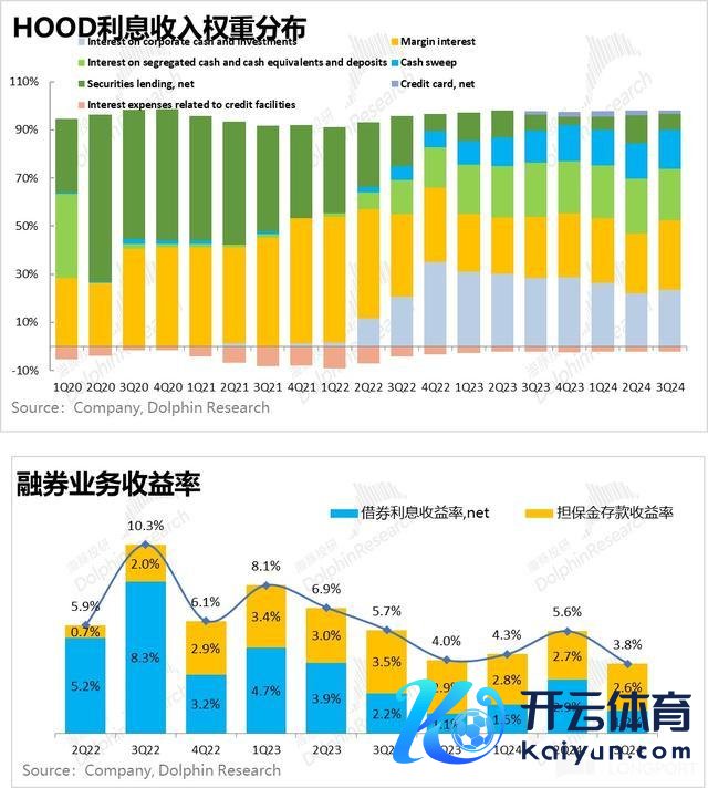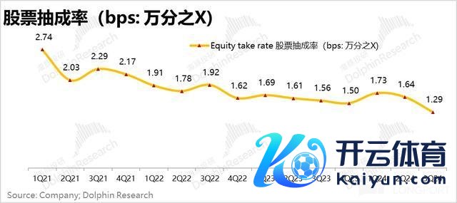 b.佣金型收入,分金钱开,股票走动活跃度小提了一下,但因变现率下落到了万分之 1.29,股票佣金环比反而时下落的;数字货币天然变现率普及了一些,但走动举止度下落,因此数字货币的收入也不才滑;只剩期权走动还算活跃,且单张抽成基本维稳的情况下,期权收入保住了;但总体三季度佣金收入亦然下滑的;