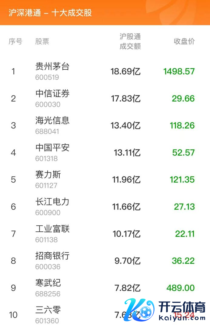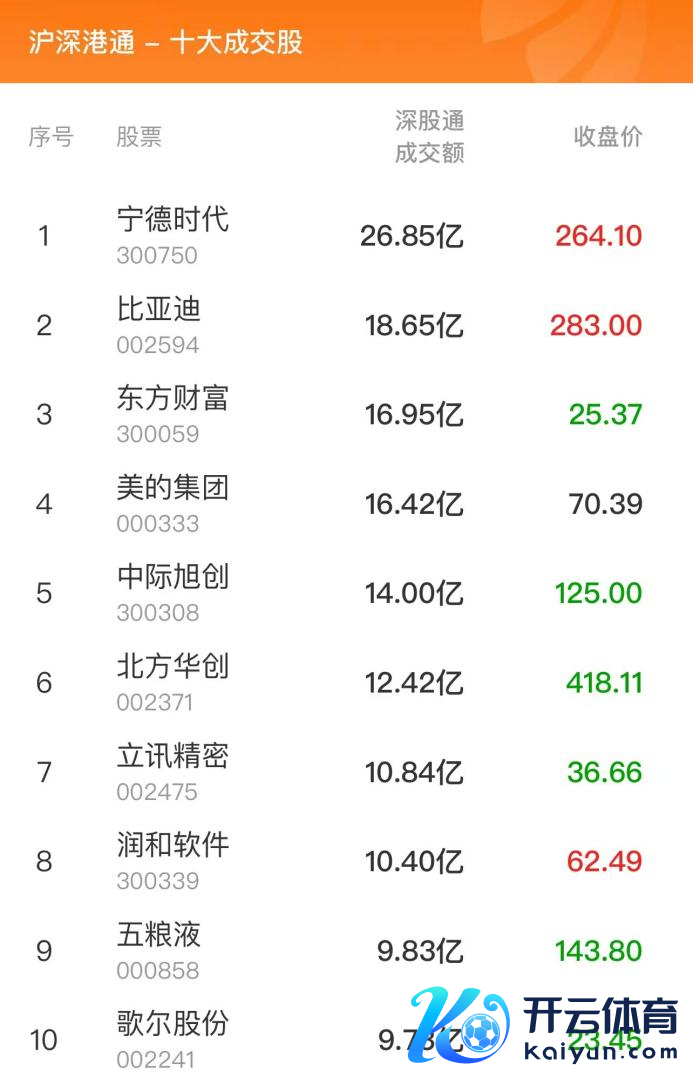 走动所公布确当日沪深港通十大成交股浮现,贵州茅台、中信证券、海光信息位列沪股通前三,成交额分袂为18.69、17.83、13.40亿元;宁德期间、比亚迪、东方钞票位列深股通前三,成交额分袂为26.85、18.65、16.95亿元。