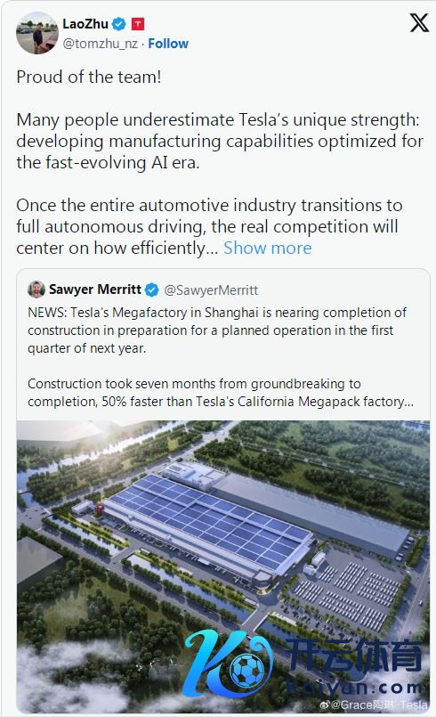 朱晓彤在X平台上发帖称:“很多东谈主低估了特斯拉的特有上风:开导为快速发展的AI期间而优化的制造智力。”