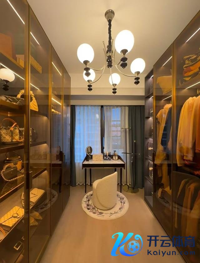 茶色的玻璃柜高等感满满,搭配中古步调的吊灯,总算是弥补了没作念衣帽间的缺憾了。